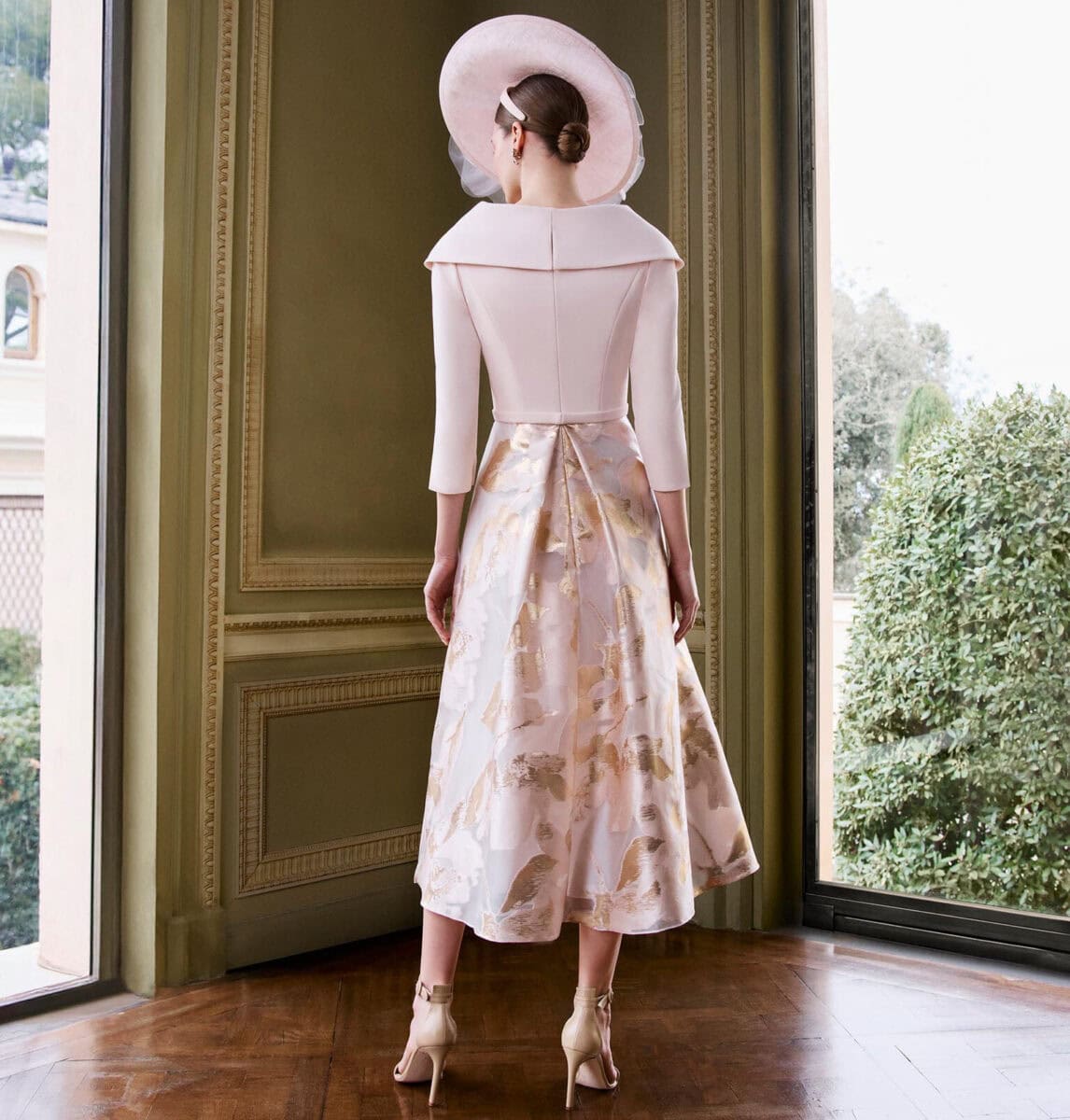 8G1D8 face Marfil robe de soirée mi longue top décolleté cache coeur avec revers manches ajustées 3/4 ceinture fine jupe organza motif floral à plis mi longue magasin de robes de soirée Annecy