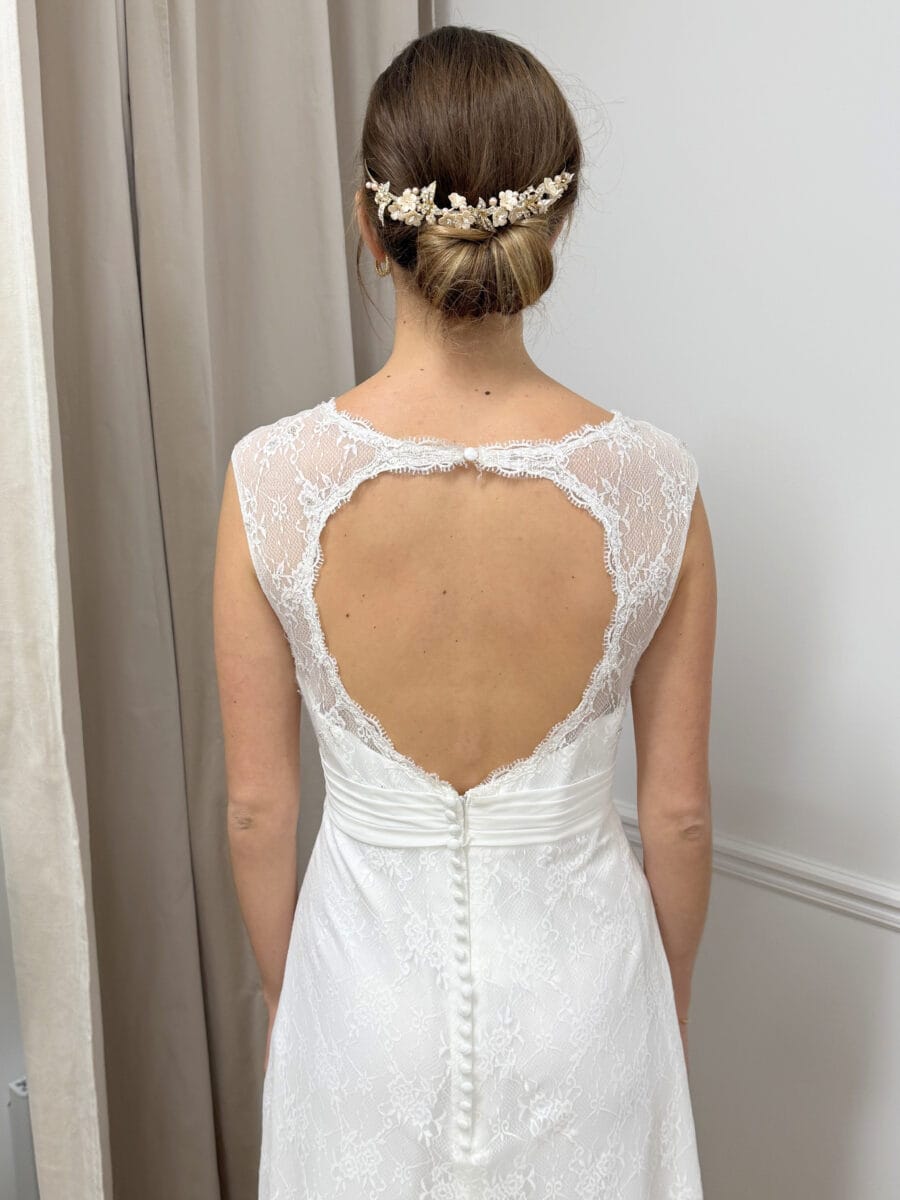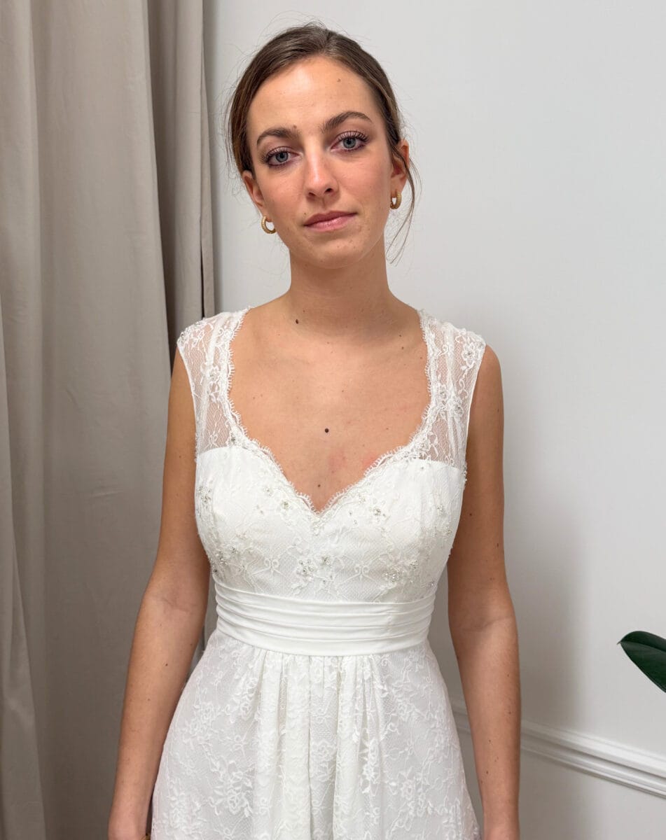 La robe de mariée 52046 signée Ladybird séduit par son allure romantique et raffinée. Sa coupe trapèze fluide (A-line) allonge la silhouette, tandis que la dentelle délicate et les bretelles ajourées apportent une touche de féminité intemporelle. Le décolleté en V met subtilement en valeur le buste, et le dos nu en forme de goutte, bordé de boutons, offre une note sensuelle et élégante. La ceinture drapée à la taille souligne avec grâce la ligne du corps. Parfaite pour une robe de mariage chic et bohème, cette création est disponible dans la boutique O’Scarlett à Paris, où vous profiterez de plus de 300 modèles, d’un atelier sur mesure et de conseillères expertes et bienveillantes.