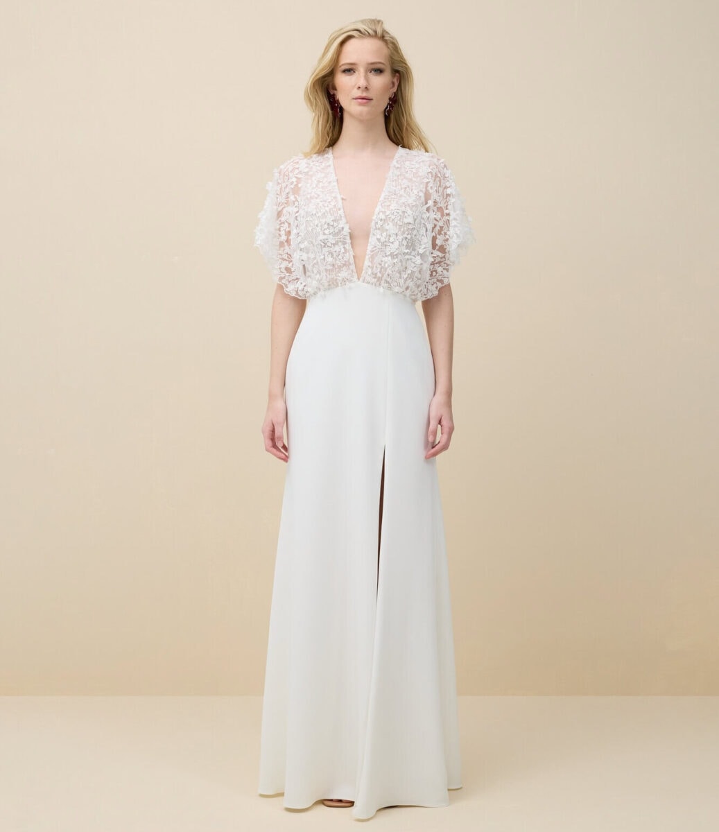 La robe de mariée Bleuet de la marque Rembo atelier, disponible à Paris, incarne une poésie moderne. Sa forme A-line, fluide et longiligne, s’élève avec grâce grâce à une jupe fendue au tombé aérien. Le top en dentelle délicate, aux motifs floraux en relief, offre un décolleté en V profond d’un raffinement bohème, tandis qu’un dos nu goutte subtilement dessiné ajoute une touche chic et tendance. Cette robe de mariage romantique séduit par son élégance naturelle. Chez O’Scarlett, vous profitez d’un choix de plus de 300 robes, d’un atelier de retouche sur mesure et de conseillères passionnées, accompagnées de stylistes et couturières expertes pour sublimer votre tenue.