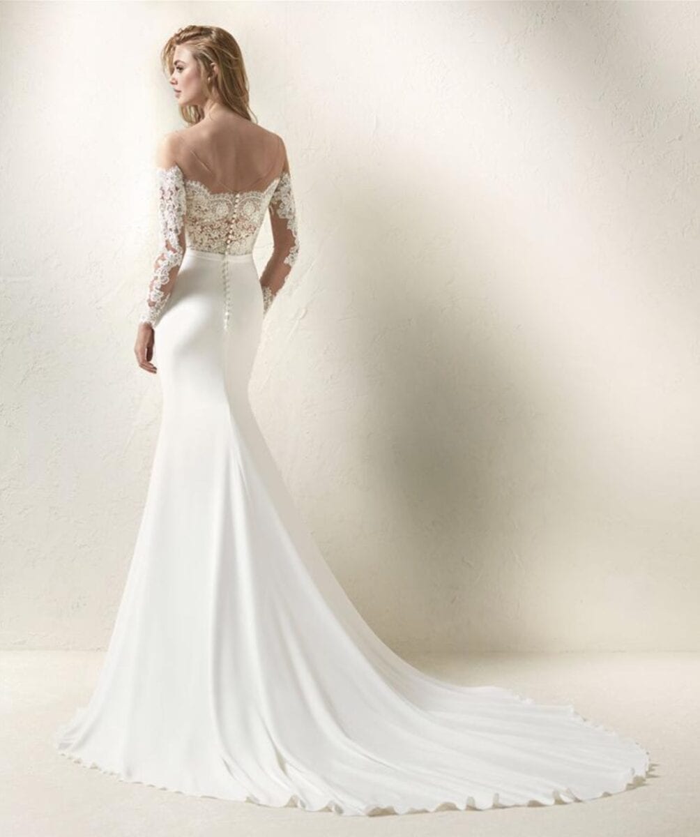 Sculpturale et infiniment raffinée, la robe de mariée Dracma de la marque Pronovias célèbre l’élégance d’une robe de mariage au charme intemporel. Sa forme sirène, près du corps et délicatement évasée en fin de jupe, sublime la silhouette avec une grâce naturelle. Le corsage en dentelle fine, orné d’un décolleté cœur subtilement illusion et de manches longues travaillées, évoque un romantisme chic et résolument tendance. Le dos élégant et la traîne fluide apportent une touche de noblesse à chaque pas. Disponible à Paris, cette création s’inscrit dans l’univers d’excellence de la maison O’Scarlett : plus de 300 robes soigneusement sélectionnées, un atelier de retouche sur mesure, des conseillères à l’écoute et des rendez-vous privilégiés avec stylistes, modélistes et couturières, véritables gardiennes d’un savoir-faire d’exception.