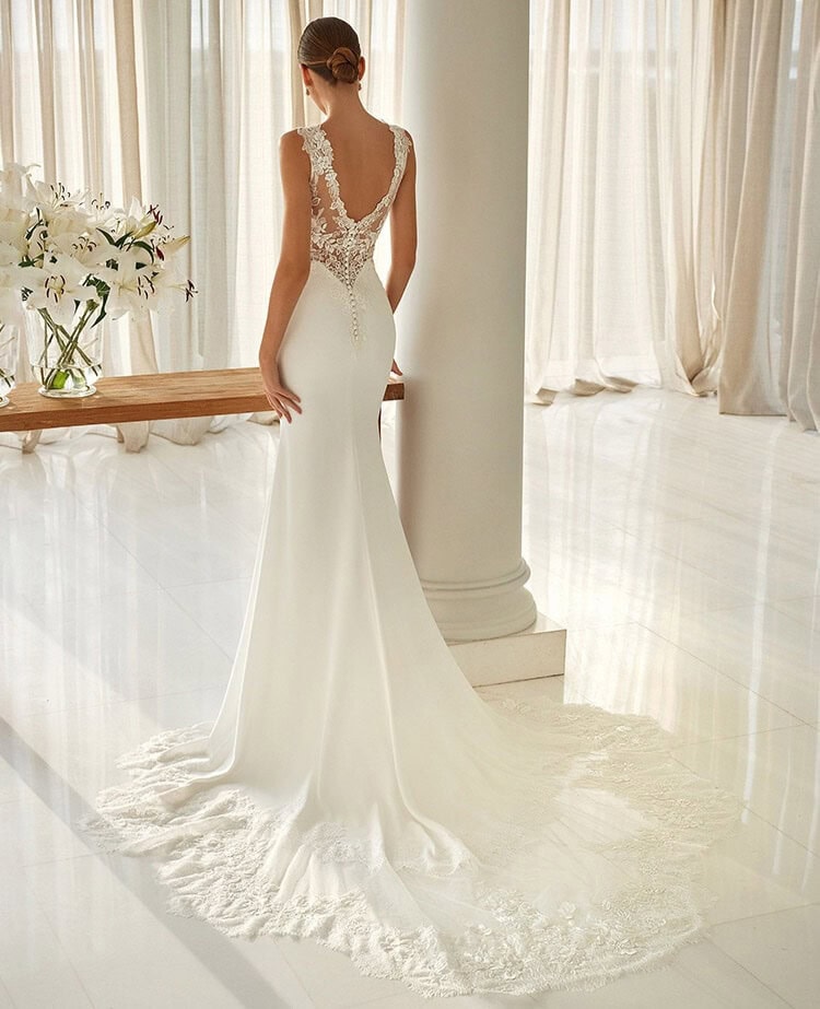 La robe de mariée Elsie de la maison San Patrick, disponible chez O’Scarlett à Paris, dévoile une silhouette sirène d’une grâce absolue. Son dos illusion finement brodé, souligné de motifs floraux raffinés, s’ouvre sur une traîne majestueuse ornée de dentelle, offrant une allure romantique et résolument chic. Le décolleté plongeant, délicatement dessiné, sublime la féminité tandis que la fluidité du crêpe épouse chaque mouvement avec élégance et modernité. Parfaite pour les futures mariées en quête d’une robe de mariage tendance, elle s’accompagne de l’expertise O’Scarlett : plus de 300 modèles, un atelier de retouche sur mesure, et des conseillères passionnées, stylistes et couturières dévouées à révéler chaque femme.