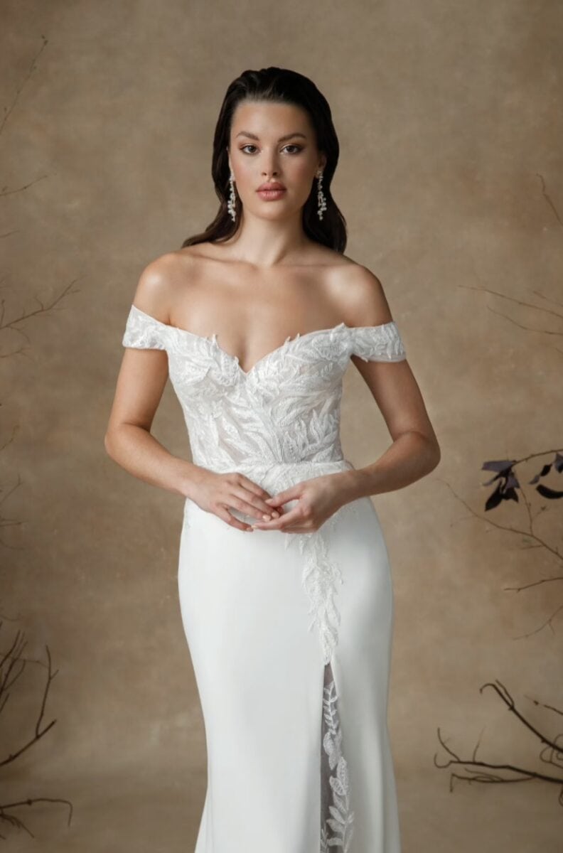 Succombez au charme envoûtant de la robe de mariée Graham signée Justin Alexander, une création sirène raffinée disponible à Annecy chez O’Scarlett. Cette robe de mariage mêle avec grâce un bustier en dentelle florale, des manches tombantes délicatement drapées et une jupe moulante sublimée par une fente ornée de motifs feuillages. Son dos échancré se prolonge en une traîne transparente brodée, offrant un effet romantique et chic inspiré d’un esprit rétro. Chez O’Scarlett, profitez d’un accompagnement sur mesure : plus de 300 modèles, un atelier de retouche expert, et des conseillères passionnées, styliste et couturières à vos côtés pour révéler votre élégance.