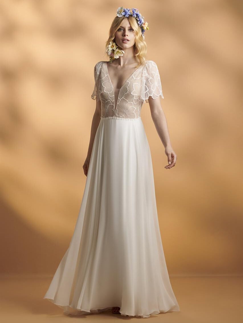 Sous un ciel doré, la robe de mariée Holly signée Rembo atelier déploie une poésie bohème irrésistible. Sa silhouette fluide, disponible à Paris, marie avec grâce un top en dentelle aux motifs floraux délicats, un décolleté V romantique et de fines manches courtes au charme raffiné. Le dos nu, subtilement graphique, apporte une touche chic et tendance, tandis que la jupe fluide en mousseline accompagne chaque pas d’une douceur envoûtante. Une robe de mariage lumineuse, élégante et naturellement sophistiquée. Chez O’Scarlett, plus de 300 robes vous attendent, un atelier de retouche sur mesure affine chaque détail, et des conseillères, stylistes et couturières expertes vous guident avec bienveillance vers la robe de vos rêves.