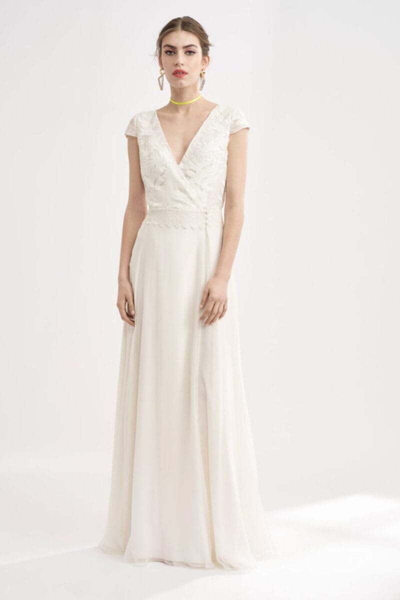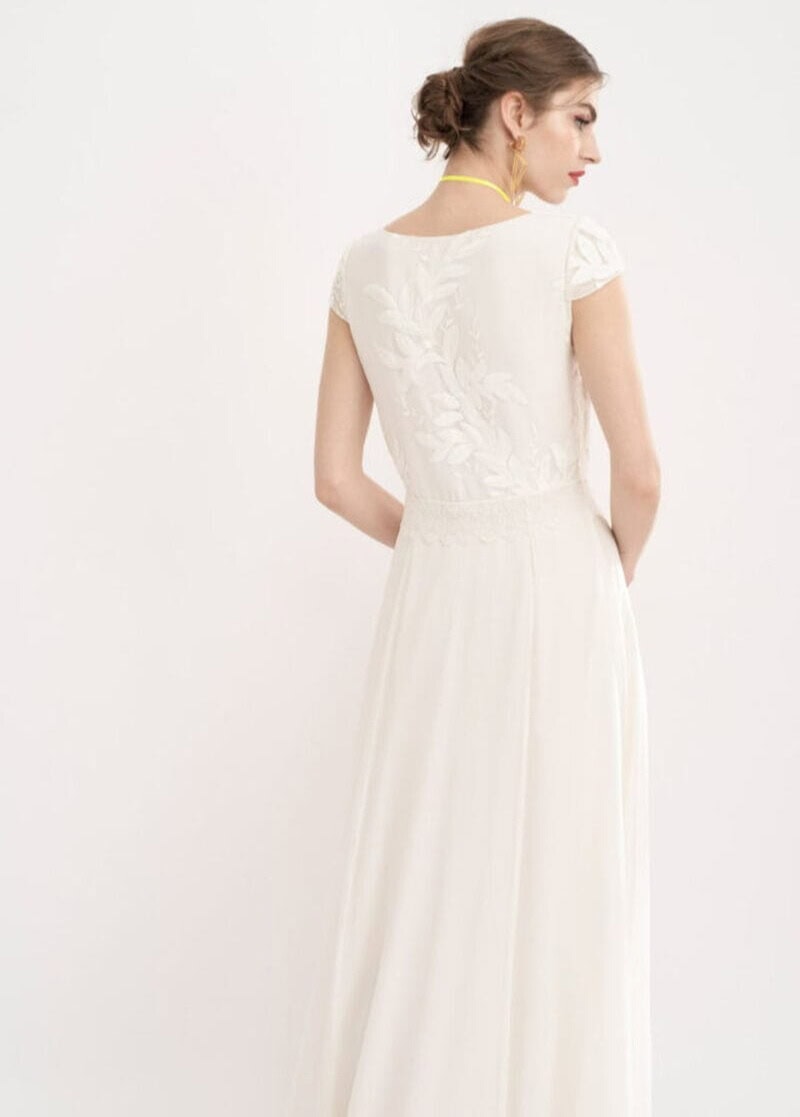 Découvrez la robe de mariée Lady Love signée Rembo Atelier, une création fluide et délicatement bohème disponible chez O’Scarlett à Paris. Cette robe de mariage fluide séduit par son top en dentelle raffinée, ses manchettes aériennes et sa jupe en crêpe de mousseline au tombé élégant. Le dos subtilement échancré ajoute une note romantique et chic, idéale pour une mariée en quête d’un style tendance et épuré. Chez O’Scarlett, vous profitez d’un accompagnement d’expertes, d’un atelier de retouche sur mesure et d’un choix incomparable de plus de 300 robes pour trouver la pièce qui révélera votre beauté naturelle.