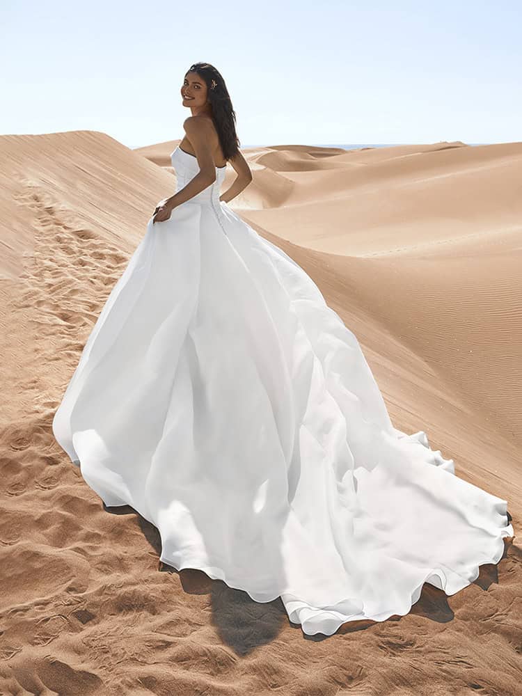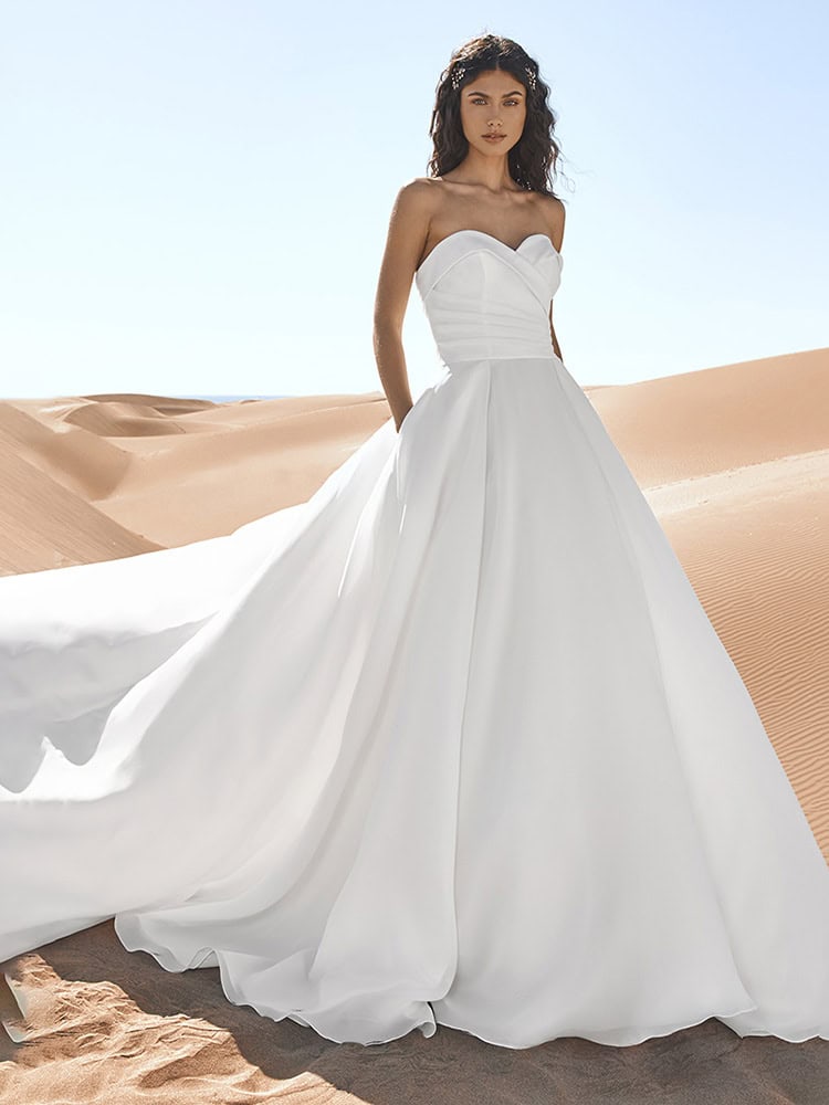 La robe de mariée Luise signée Pronovias déploie son souffle princier dans notre boutique de Paris. Cette somptueuse robe de mariage de forme princesse, façonnée en satin majestueux, mêle un bustier cœur perlé à un drapé asymétrique délicatement posé sur l’épaule. La jupe ample, animée de plis royaux, glisse avec grâce, évoquant l’élégance rétro et le chic intemporel des années 60. Chez O’Scarlett, plus de 300 modèles enchantent chaque future mariée, accompagnée par des conseillères attentionnées, un atelier de retouche sur mesure et des rendez-vous avec stylistes, modélistes et couturières expertes, pour une expérience aussi raffinée que la robe elle-même.