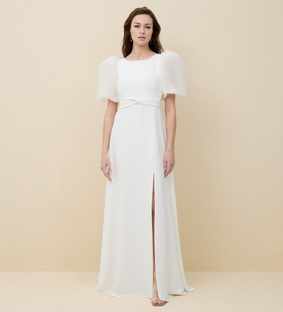 Élégance et grâce s’unissent dans la robe de mariée Promise signée Rembo atelier, une robe de mariage fluide au charme bohème et raffiné, disponible à Paris. Son corsage lisse au décolleté rond, ses manches courtes bouffantes délicatement texturées et son dos nu en forme de goutte composent une silhouette romantique et profondément élégante. La jupe fendue en crêpe et mousseline accompagne chaque pas d’un mouvement fluide, moderne et chic. Chez O’Scarlett, vous profitez d’un univers d’exception : plus de 300 robes, un atelier de retouche sur mesure, des conseillères attentives et des rendez-vous avec stylistes, modélistes et couturières passionnées, dévouées à sublimer chaque mariée.